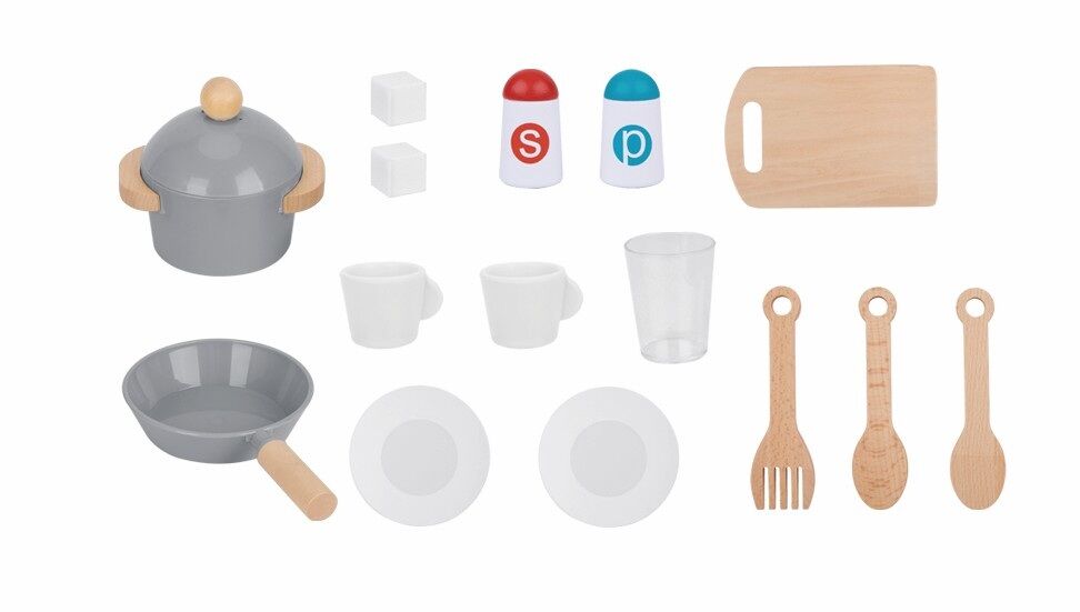 Die Küche wird durch ein umfangreiches Zubehörset ergänzt, das einen Topf mit Deckel, eine Bratpfanne, ein Schneidebrett, Küchenutensilien in Form von 3 Holzlöffeln, 2 Tellern, 2 Tassen, einem Glas, einem Salzstreuer, einem Pfefferstreuer, zwei Eiswürfeln und einer Uhr mit drehbaren Zeigern umfasst. Damit haben kleine Köche alles, was sie zum Zubereiten und Servieren ihrer kulinarischen Kreationen benötigen.