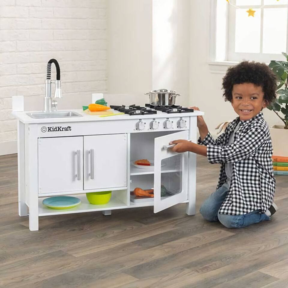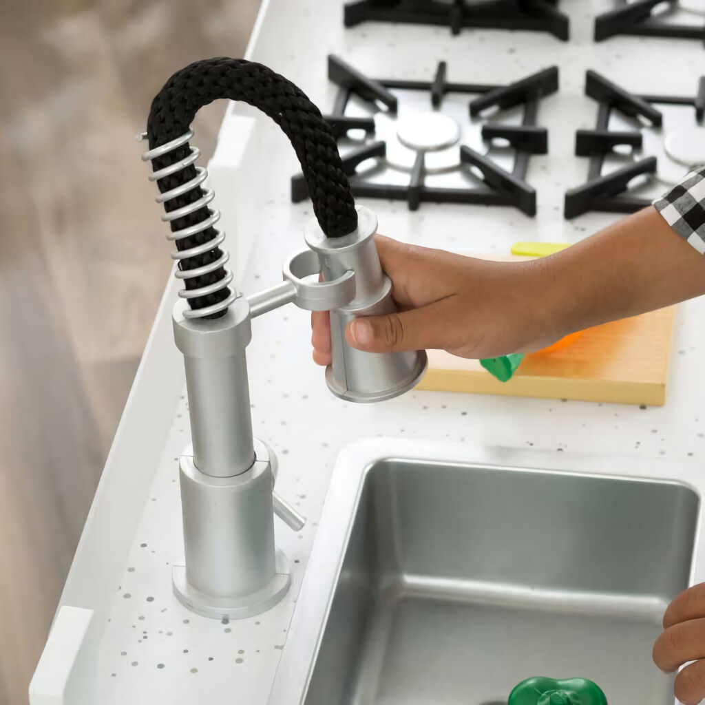 Kochen Sie wie ein Profi, sauber und mit Eleganz. Die Küchenzeile verfügt über ein Waschbecken mit einer praktischen Dusche an einem flexiblen Arm, einen großen Multifunktionsherd mit vier Brennern, einen großen Stauraum mit einer praktischen Tür und ein hübsches Schneidebrett. In der Backofentür befindet sich eine Vitrine, durch die Sie die zubereiteten Speisen bewundern können. Das Drehen der Bedienknöpfe des Backofens wird von Klickgeräuschen begleitet, die eine Rückmeldung geben und die Glaubwürdigkeit der Spiele erhöhen. Das Produkt erfordert eine Montage, die mit einer ausführlichen Montageanleitung geliefert wird.