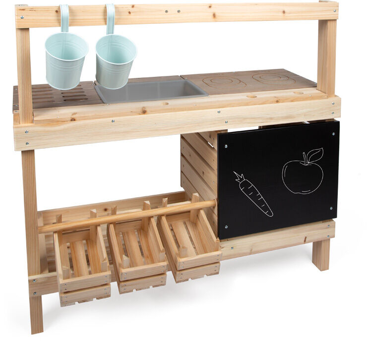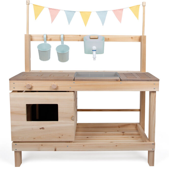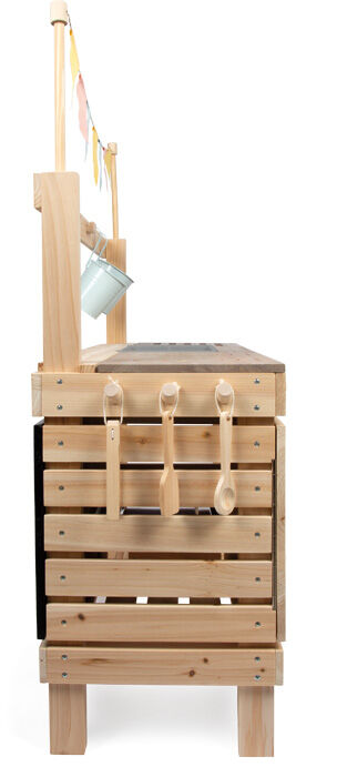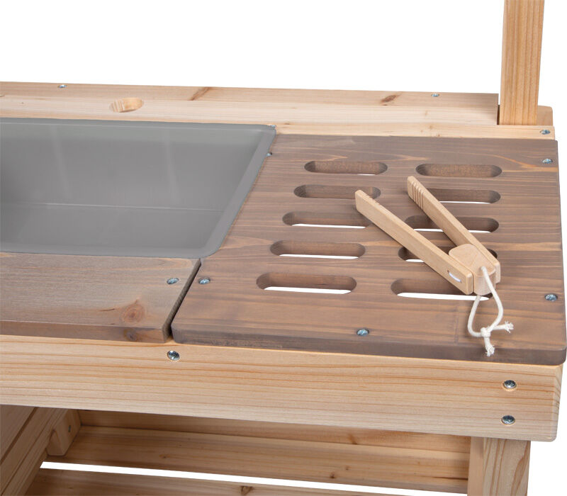 Diese hochwertige, extra große Outdoor-Kinderküche mit stabilem Holzgestell bietet ein einzigartiges Spielerlebnis im Freien. Sie ist von beiden Seiten zugänglich und mit vielfältigem Zubehör ausgestattet: Auf der einen Seite dient sie als Küche zum Kochen, Mischen und Experimentieren mit Wasser oder Knete, auf der anderen als Laden oder Werkstatt, die zum kreativen Spielen mit Kauf und Verkauf anregt. Zu den Hauptelementen gehören ein Backofen mit Drehknöpfen und Auszugsblech, ein Kochfeld mit eingravierten Symbolen und Touch-Bedienung sowie eine Spüle mit Wasserspender und Wasserhahn. Außerdem gibt es einen Grillbereich, drei Holzkisten, Hängeblumentöpfe, Regale, Küchenutensilien aus Metall, Küchenzubehör und eine dekorative Fahne, die der Küche einen besonderen Charme verleiht. Eine Tafel, seitliche Haken, viel Stauraum und eine kontrastierende Arbeitsplatte runden das Angebot ab. Praktische Löcher zur Aufbewahrung von Spielgeräten sorgen für Ordnung. Diese multifunktionale Outdoor-Küche und -Werkstatt besticht nicht nur durch ihr anspruchsvolles Design und die Wasserspiele, sondern auch durch ihre hochwertige Verarbeitung. Ob als Küche, Werkstatt oder Laden – Kinder entwickeln spielerisch ihre motorischen, sprachlichen und sozialen Fähigkeiten und haben stundenlangen Spielspaß. Für eine lange Lebensdauer empfehlen wir, unbehandeltes Holz regelmäßig mit einer Schutzlasur zu behandeln.
