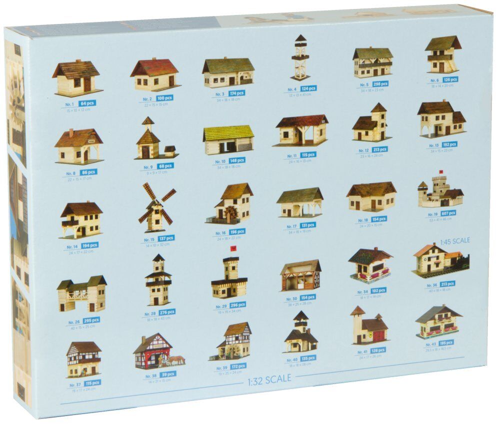 In den HOBBY KITS-Bausätzen finden Sie alles, was Sie für den Zusammenbau benötigen. Einfache bebilderte Anleitungen mit Symbolen für die einzelnen Schritte sind vorhanden, so dass sie von Kindern auf der ganzen Welt zusammengebaut werden können. Das Basismaterial sind präzise gefertigte Kiefernhölzer mit den Maßen 9×9 mm in Längen von 16 bis 230 mm für den Bau von Holzwänden. Dächer, Giebel, Pavillons und Terrassen sind aus 3 mm starkem Sperrholz gefertigt und mit Papierdrucken versehen. Mit Folie verglaste Funktionstüren und Fenster werden aus bedrucktem Karton hergestellt. Die einzelnen Gebäude werden mit Holz- und Papierkleber (nicht im Lieferumfang enthalten) zusammengeklebt. Die Anleitungen enthalten kleine Kapitel über das Bauwesen und die Geschichte der volkstümlichen Architektur. Die Gebäudemodelle sind im Maßstab 1:32 gehalten.