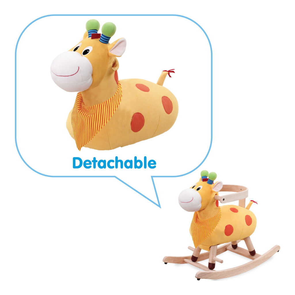 Diese sanfte Schaukel ist nicht gewöhnlich. Es ist eine Plüschgiraffe mit einer Holzstruktur. Er hat Griffe, Fußstützen und auch eine schützende Rückenlehne, die für kleinere Kinder geeignet ist. Wenn Ihre Kinder größer und sicherer auf der Schaukel werden, können Sie diese Rückenlehne entfernen.